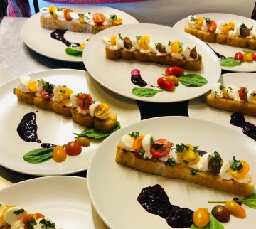 Mini mozzarella s cherry rajčaty, bazalkové pesto, opečený toust, listy špenátu