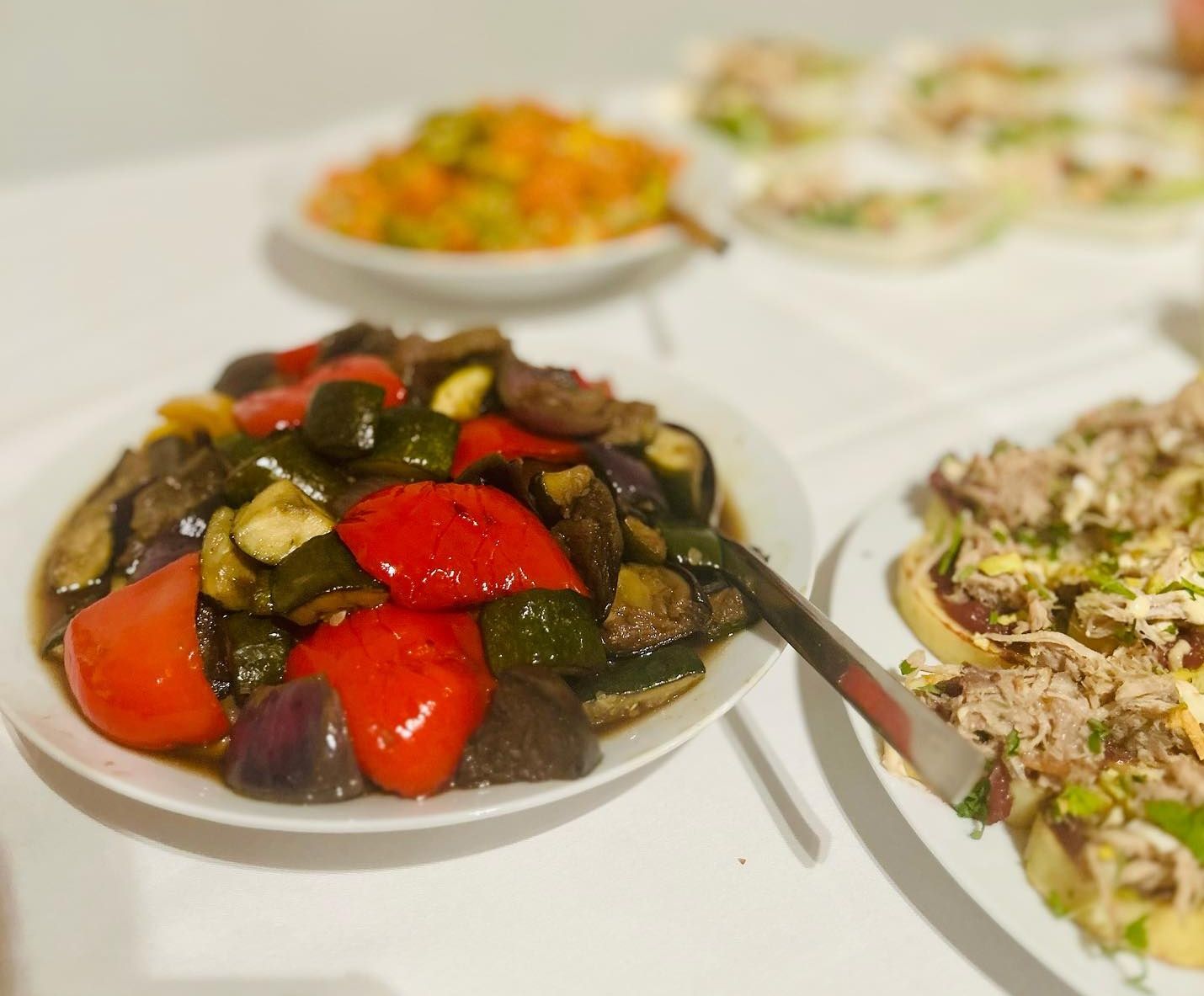 Zeleninový bufet - mix salátů, rajčata, okurky, papriky a doplňky (olivy, balkánský sýr, slanina, olivový olej, dip, bylinková foccacia)