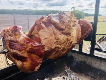 Produkty z naší udírny (hovězí svíčková, vepřová kýta, kachní prsíčka) a doplňky (křen, hořčice, beraní rohy, pečivo)