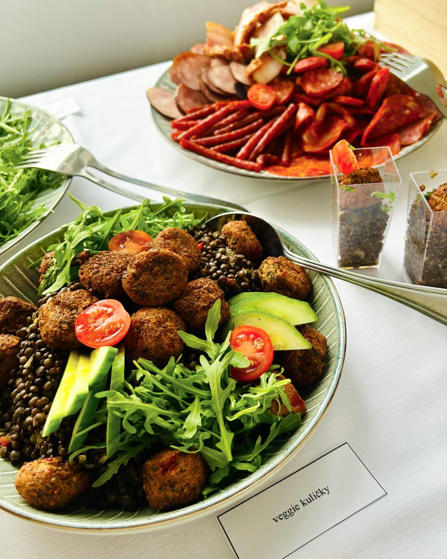 Salát z černé čočky a stříbrné cibulky, pečená paprika, plátky zauzených