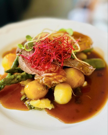 Kuřecí prsíčka, vepřová panenka se zeleným chřestem, pečené mladé brambůrky s jarní cibulkou